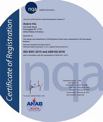 AUSCO’s Quality Management System focuses on continued process improvement, product integrity, and customer satisfaction.  We are a registered ISO9001: 2015/AS9100:2016 organization.  Our Quality commitment tracks every phase of product activity, beginning with design, through fabrication, assembly, test, final inspection, delivery, and service.